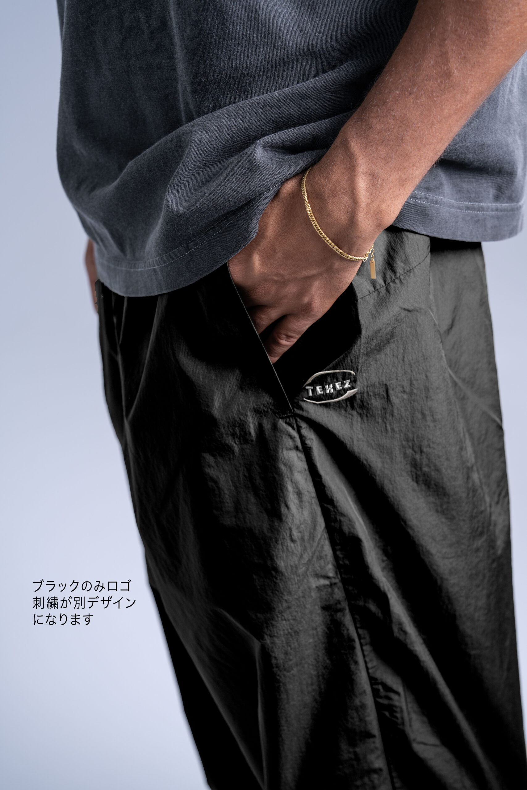 メンズ・ユニセックス対応のワイドナイロンパンツ。