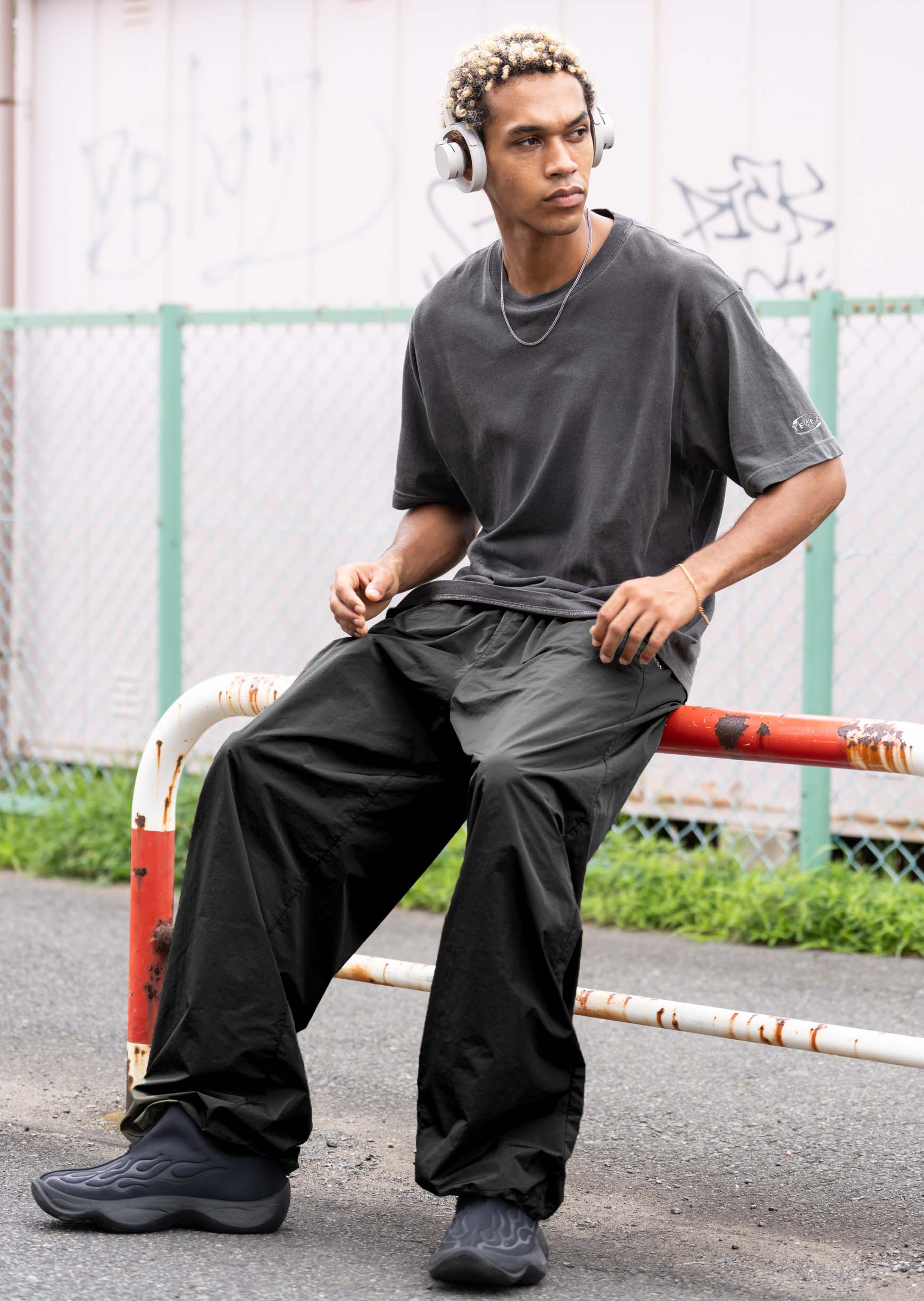 速乾性に優れた軽量ナイロン素材を採用し、シャカシャカした質感が軽快さとスポーティさを演出。 動きやすさを追求した設計で、アクティブなシーンにも最適です。大胆なワイドシルエットがモダンなストリート感を醸し出し、シンプルながらも印象的な存在感を放ちます。